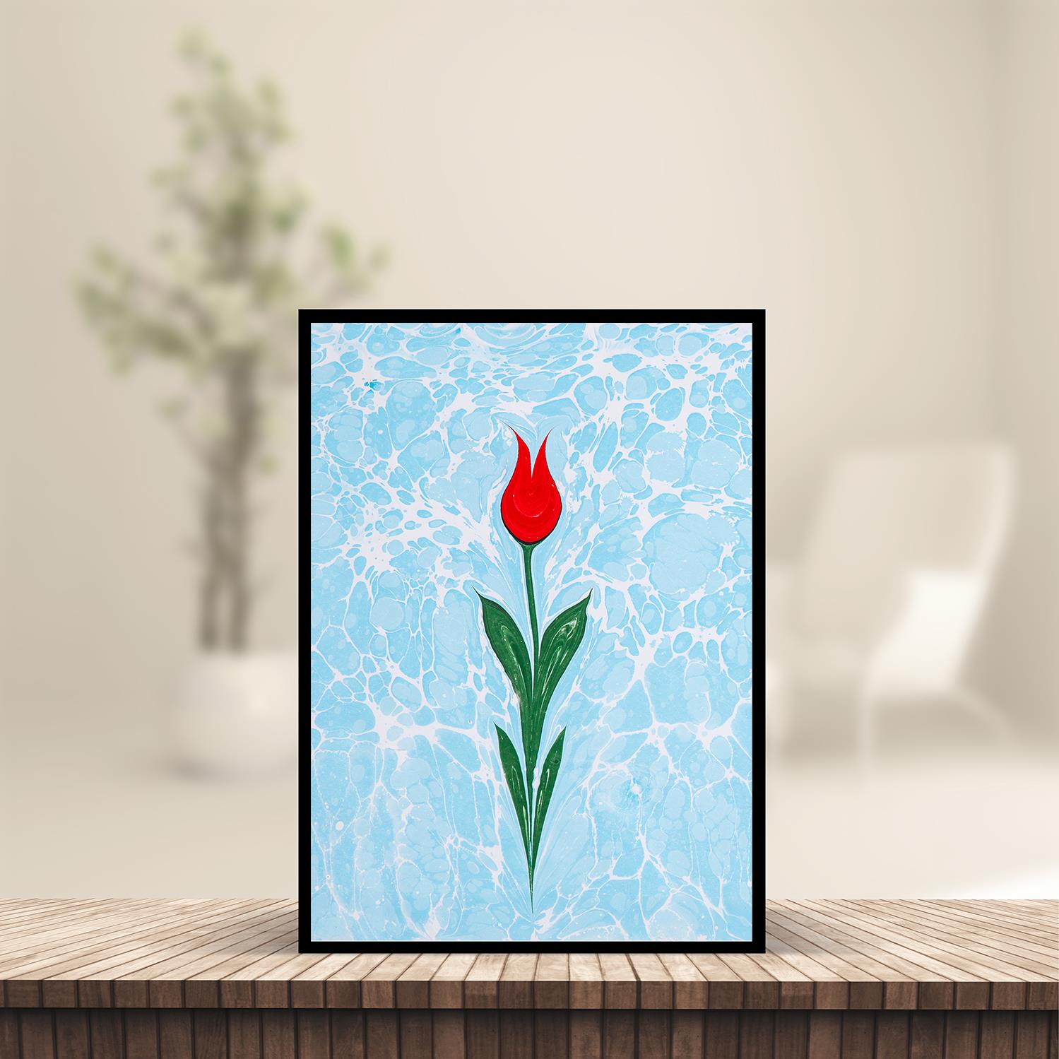 Lale - Mavi Ebru Zemin - Masaüstü, Duvar Çerçevesi, 14cmx19,50cm, A5 Boyut